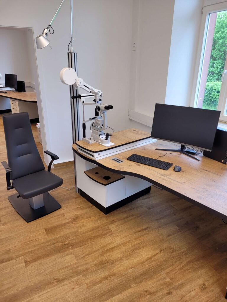 Für das Augenzentrum Dr. Berret in Mosbach haben wir maßgefertigte Einheiten entwickelt, die den Charme eines liebevoll sanierten Altbaus aufnehmen und zugleich den funktionalen Anforderungen einer modernen Augenarztpraxis gerecht werden. Zentrales Gestaltungselement sind melierte Holz-Arbeitsflächen mit schwarzen Akzenten sowie eine individuelle, langgestreckte und teils oval abgerundete Form der Einheiten – für einen fließenden Raumverlauf und nahtlose Integration in die Architektur.